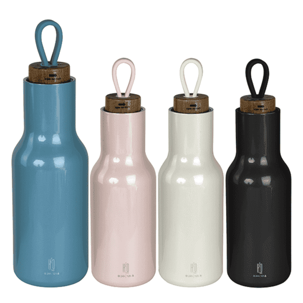 בקבוק תרמי נירוסטה חם / קר עם מכסה עץ ומאחז סיליקון ידית במארז גליל מהודר מבית H2O-Pro