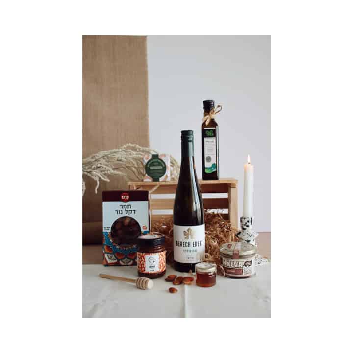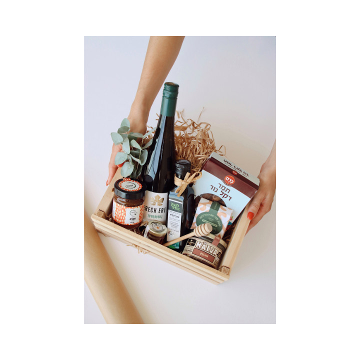 מארז עשיר ומלא ניחוחות, שמביא איתו את כל הטוב של הארץ לשולחן החג. שמן זית מובחר ממשק אחיה, יין אדום ""דרך הארץ"", תמר מג'הול עסיסי, חלבה איכותית, ריבת תאנים בוטיקית, דבש מוקטן עם מקל דבש, סבון ריחני בעבודת יד וארגז עץ מהודר. חגיגה של טעמים, מתיקות ורוגע – מתנה שמשלבת מסורת, איכות וסטייל ישראלי."