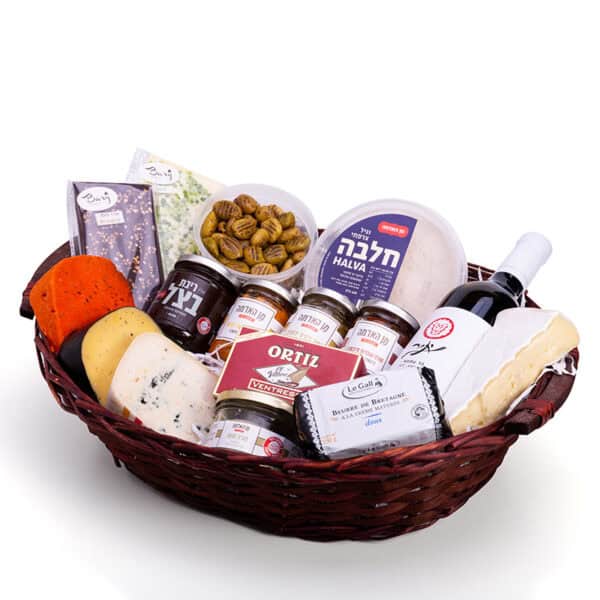 בתוכו תמצאו יין אדום יתיר 'הר עמשא', חלבה וניל צרפתי, חמאה צרפתית מיושנת, שלישיית ממרחי הבית – לימון כבוש, טפנד זיתים ועגבניות מיובשות, שוקולד לבן בתוספת ליים ושוקולד מריר בתוספת קרוקנט לוז, 4 סוגי גבינות(800ג') -ברי צרפתי ,גאודה כמהין, בלו דה חראוון, גאודה פסטו אדום, ריבת בצל, חמאת שום , זית על האש 200ג' וטונה לבנה מובחרת 'אורטיז'.